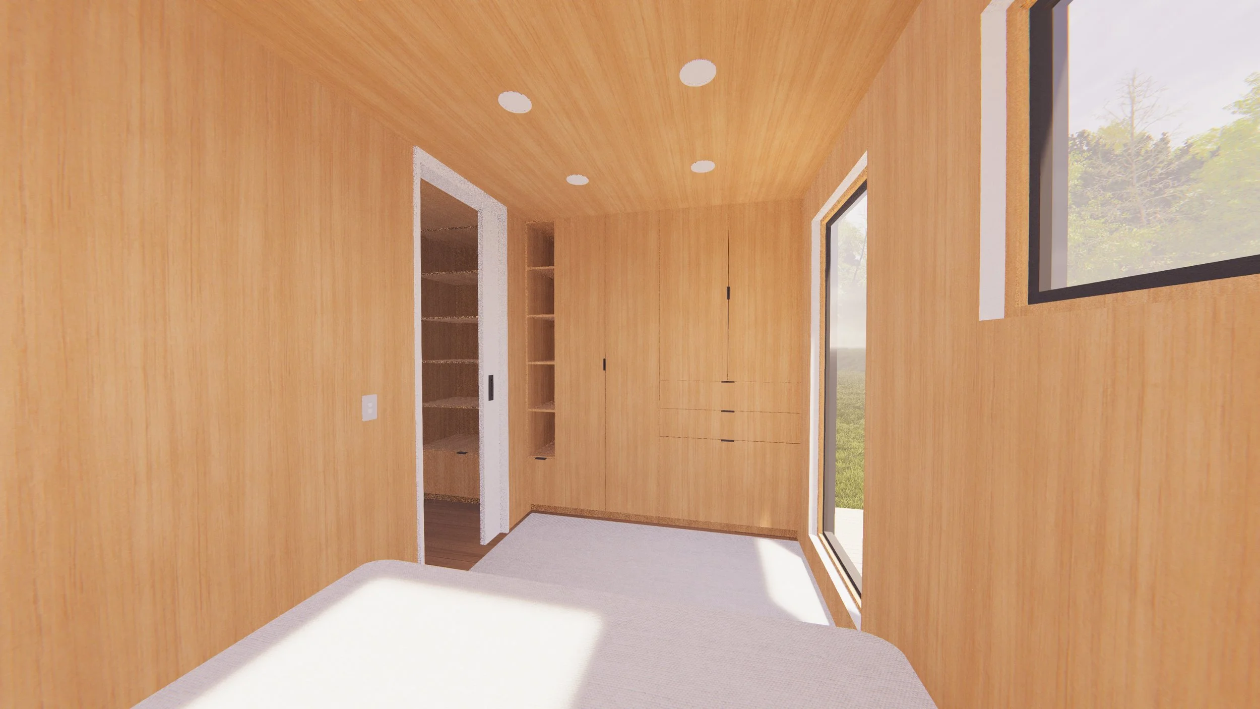 The all-wood design of the master bedroom helps to create deep sense of warmth and tranquility upon entry. This bedroom features a cozy, king-sized bed, a full storage lined wall, complete with a frosted glass door to the deck and a skylight for stargazing at bedtime.