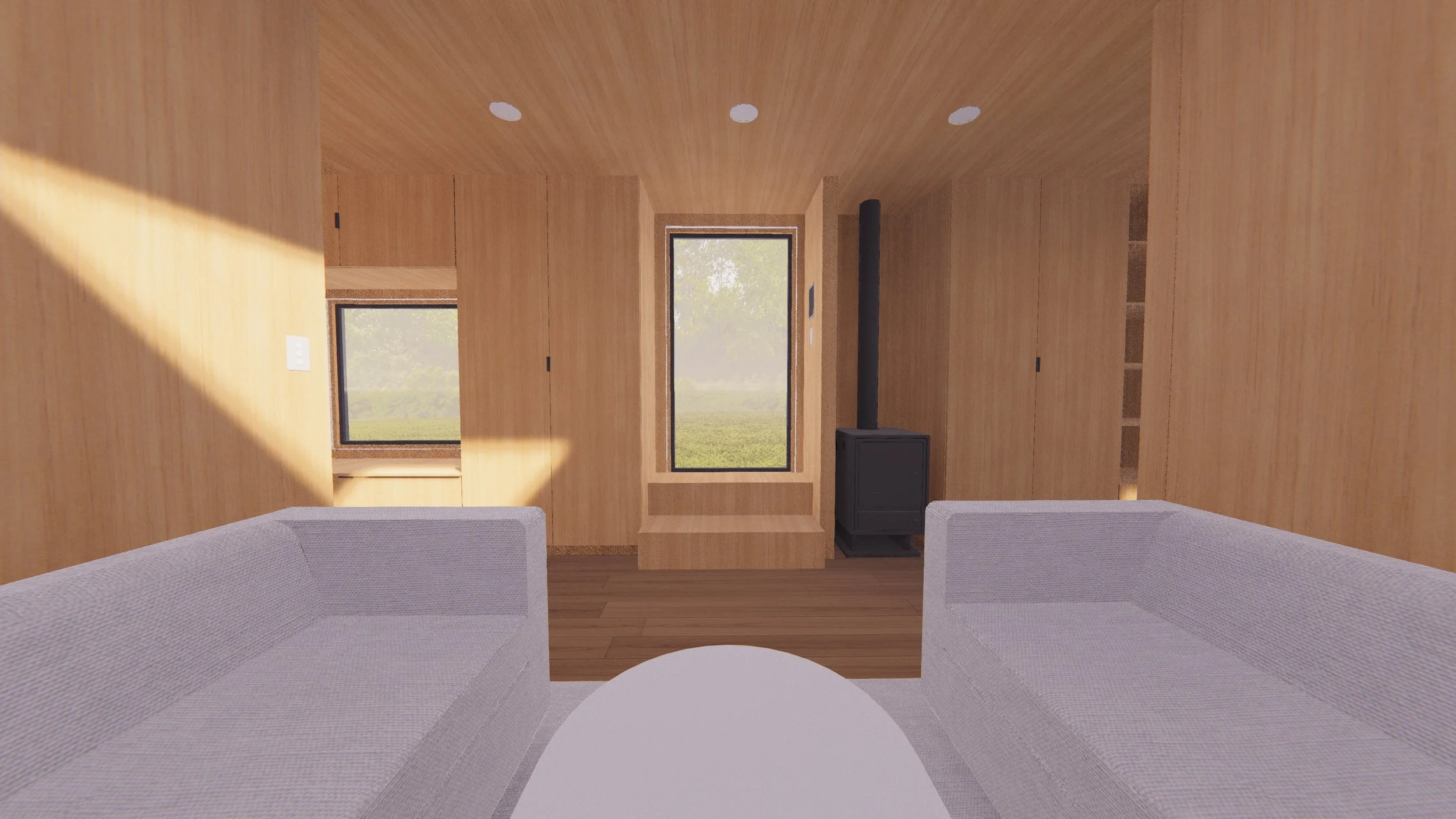 Our innovative container cottage features a spacious, luxurious galley kitchen, with a generously sized dining island, designed for culinary enthusiasts who love to cook while they entertain. The kitchen is complete with a designated workspace, and window seat with ample storage.